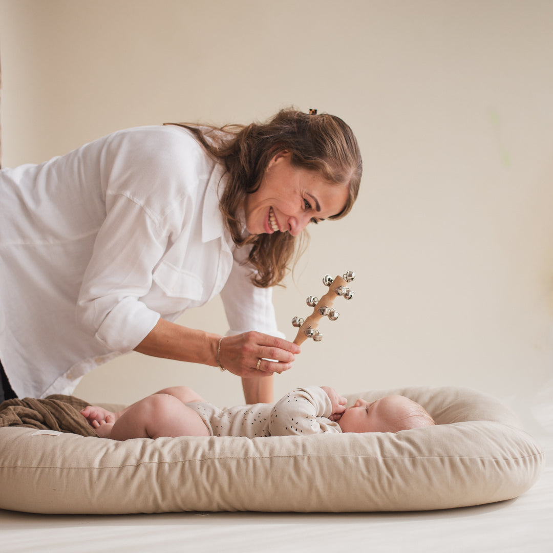 "Es ist einfach schön ganz bewußt kleine aktive Interaktions-Momente gemeinsam mit dem Baby zu schaffen. Man nimmt sich Zeit und widmet diesen Moment nur dem Baby ohne Ablenkung. Akustische Impulse mit Glocken und Rasseln aus Holz können mehrere Sinne gleichzeitig ansprechen und lassen diese Momente zu ersten kleinen gemeinsamen Erlebnissen werden."