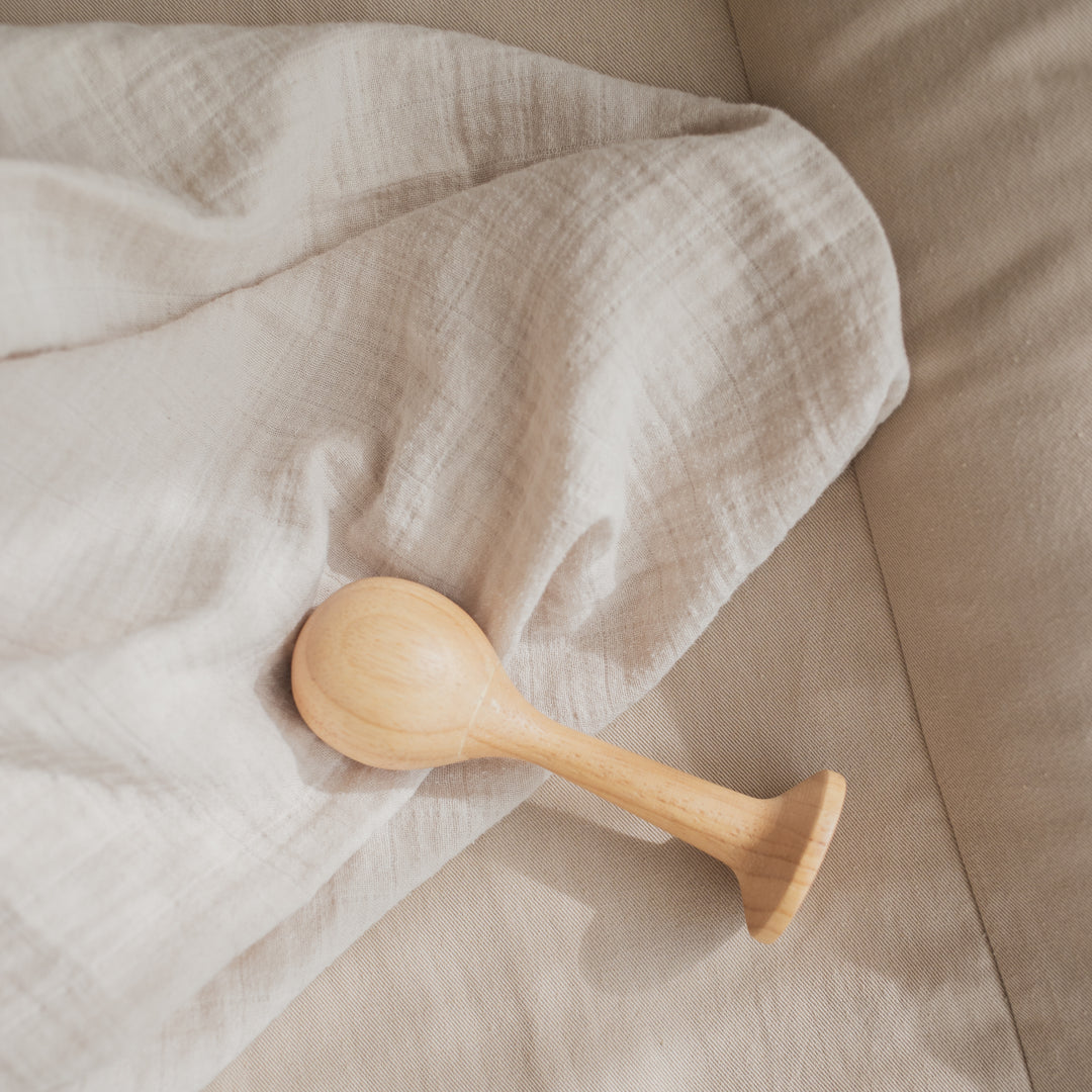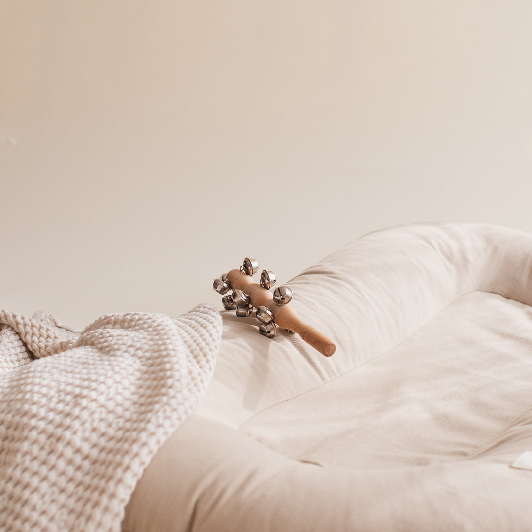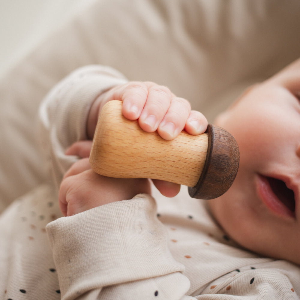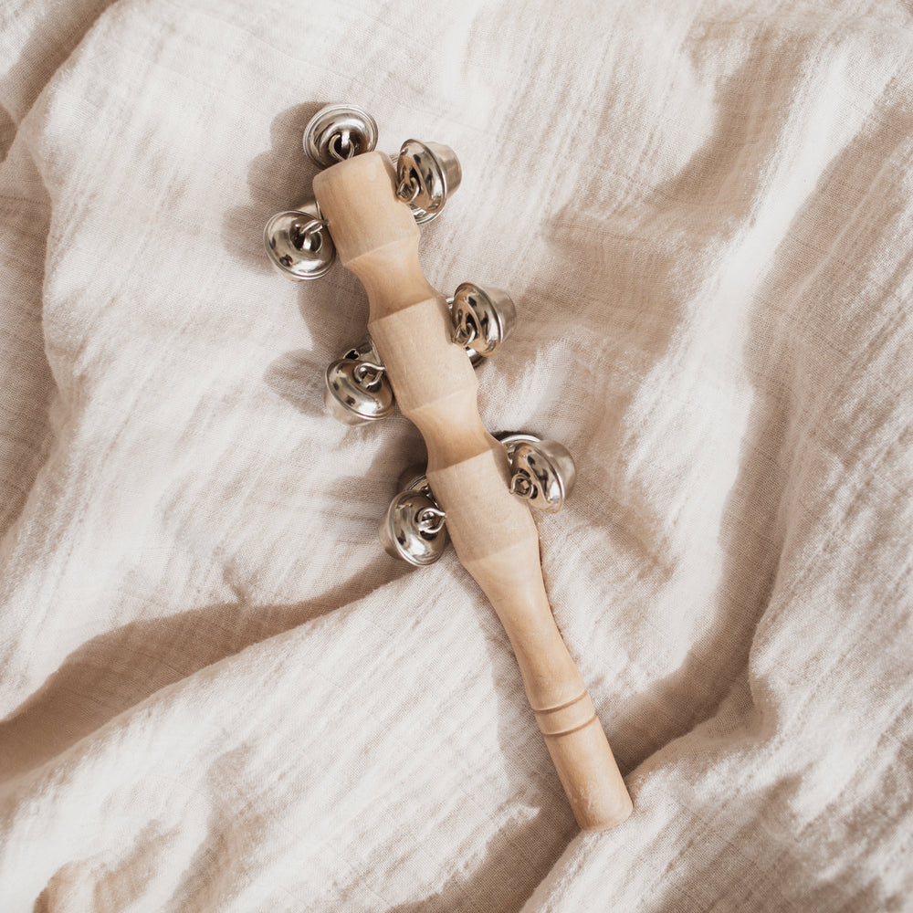 "Es ist einfach schön ganz bewußt kleine aktive Interaktions-Momente gemeinsam mit dem Baby zu schaffen. Man nimmt sich Zeit und widmet diesen Moment nur dem Baby ohne Ablenkung. Akustische Impulse mit Glocken und Rasseln aus Holz können mehrere Sinne gleichzeitig ansprechen und lassen diese Momente zu ersten kleinen gemeinsamen Erlebnissen werden."